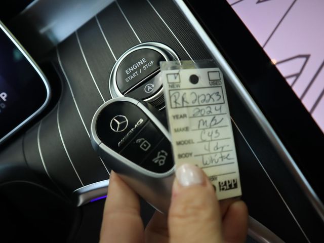 2024 Mercedes-Benz C-Class C 43 AMG(R) 4MATIC(R) White 4MATIC(R) 4MATIC(R) 9-Speed Automatic I4 4MATIC(R), 11.9" Center Touchscreen Display, 4-Wheel Disc Brakes, 5 Speakers, ABS brakes, Adaptive suspension, Air Conditioning, Alloy wheels, AM/FM radio, Apple CarPlay(R)/Android Auto(R), Auto High-beam Headlights, Auto tilt-away steering wheel, Auto-dimming door mirrors, Auto-dimming Rear-View mirror, Automatic temperature control, Brake assist, Bumpers: body-color, Compass, Delay-off headlights, Driver door bin, Driver vanity mirror, Dual front impact airbags, Dual front side impact airbags, Electronic Stability Control, Emergency communication system: Mercedes-Benz Emergency Call Service, Exterior Parking Camera Rear, Four wheel independent suspension, Front anti-roll bar, Front Bucket Seats, Front Center Armrest, Front dual zone A/C, Front reading lights, Fully automatic headlights, Garage door transmitter: HomeLink, Genuine wood dashboard insert, Head restraints memory, Heated door mirrors, Heated front seats, Illuminated entry, Knee airbag, Leather steering wheel, Low tire pressure warning, MB-Tex/Microfiber Upholstery, Memory seat, Occupant sensing airbag, Outside temperature display, Overhead airbag, Overhead console, Panic alarm, Passenger door bin, Passenger vanity mirror, Power adjustable front head restraints, Power door mirrors, Power driver seat, Power Heated Front Seats w/Memory, Power moonroof, Power passenger seat, Power steering, Power windows, Premium audio system: MBUX, Radio data system, Radio: FrontBass 5-Speaker Audio System, Rain sensing wipers, Rear anti-roll bar, Rear fog lights, Rear reading lights, Rear seat center armrest, Rear window defroster, Remote keyless entry, Security system, Speed control, Speed-sensing steering, Split folding rear seat, Spoiler, Sport steering wheel, Steering wheel memory, Steering wheel mounted audio controls, Tachometer, Telescoping steering wheel, Tilt steering wheel, Traction control, Trip computer, Turn signal indicator mirrors, Variably intermittent wipers, Weather band radio, Wheels: 18" x 8.0J AMG(R) 10-Spoke, 4MATIC(R).