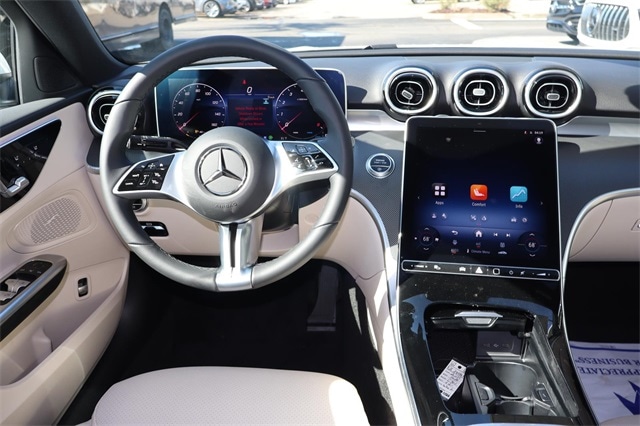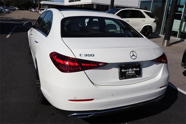2025 Mercedes-Benz C-Class C 300 White RWD 9-Speed Automatic 2.0L I4 Turbocharged 11.9" Center Touchscreen Display, 18" 5-Spoke Wheels, 4-Wheel Disc Brakes, 5 Speakers, ABS brakes, Air Conditioning, Alloy wheels, AM/FM radio: SiriusXM, Anti-whiplash front head restraints, Apple CarPlay(R)/Android Auto(R), Auto High-beam Headlights, Auto tilt-away steering wheel, Auto-dimming door mirrors, Auto-dimming Rear-View mirror, Automatic temperature control, Brake assist, Bumpers: body-color, Child-Seat-Sensing Airbag, Compass, Delay-off headlights, Driver door bin, Driver vanity mirror, Dual front impact airbags, Dual front side impact airbags, Electronic Stability Control, Emergency communication system: Mercedes-Benz Emergency Call Service, Exterior Parking Camera Rear, Four wheel independent suspension, Front anti-roll bar, Front Bucket Seats, Front Center Armrest, Front dual zone A/C, Front reading lights, Fully automatic headlights, Garage door transmitter: HomeLink, Genuine wood dashboard insert, Head restraints memory, Heated door mirrors, Heated front seats, Illuminated entry, Knee airbag, Leather steering wheel, Low tire pressure warning, Lumbar Support, MB-Tex Upholstery, Memory seat, Occupant sensing airbag, Outside temperature display, Overhead airbag, Overhead console, Panic alarm, Passenger door bin, Passenger vanity mirror, Power adjustable front head restraints, Power door mirrors, Power driver seat, Power Heated Front Seats with Memory, Power moonroof, Power passenger seat, Power steering, Power windows, Premium audio system: MBUX, Radio data system, Radio: FrontBass 5-Speaker Audio System, Rain sensing wipers, Rear anti-roll bar, Rear fog lights, Rear reading lights, Rear seat center armrest, Rear window defroster, Remote keyless entry, Security system, SiriusXM Satellite Radio, Speed control, Speed-sensing steering, Split folding rear seat, Steering wheel memory, Steering wheel mounted audio controls, Tachometer, Telescoping steering wheel, Tilt steering wheel, Traction control, Trip computer, Turn signal indicator mirrors, Variably intermittent wipers, Weather band radio.