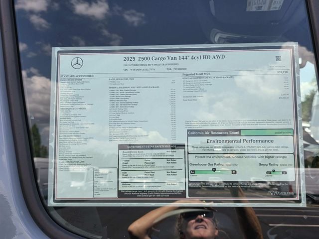 2025 Mercedes-Benz Sprinter 2500 Cargo 144 WB 4MATIC(R) Gray 4MATIC(R) 4MATIC(R) 9-Speed Automatic 2.0L I4 Diesel Turbocharged High Output 16" x 6.5J Steel Wheels, 3.923 Axle Ratio, 4-Wheel Disc Brakes, 5 Speakers, ABS brakes, Air Conditioning, All Wheel Drive Package, AM/FM radio, Armrest for Driver's Seat, Armrest for Front Passenger's Seat, Bodyside moldings, Brake assist, Co-Driver Thorax-Pelvis Sidebag, Driver door bin, Driver's Seat Mounted Armrest, Driver's Seat Occupancy Sensor, Dual front impact airbags, Dual front side impact airbags, Electronic Stability Control, Emergency communication system, Exterior Parking Camera Rear, Front anti-roll bar, Front Bucket Seats, Front Passenger Airbag, Front wheel independent suspension, Fully automatic headlights, Heated door mirrors, Heated Driver's Seat, Heated front seats, Illuminated entry, Low tire pressure warning, Maturin Fabric Upholstery, No Factory Installed Flooring, Outside temperature display, Overhead airbag, Overhead console, Passenger door bin, Passenger seat mounted armrest, Power door mirrors, Power steering, Power windows, Radio: Standard, Rain sensing wipers, Rear anti-roll bar, Remote keyless entry, Speed control, Speed-sensing steering, Standard Driver Seat, Standard Front Passenger Seat, Steering wheel mounted audio controls, Tachometer, Tilt steering wheel, Traction control, Variably intermittent wipers.