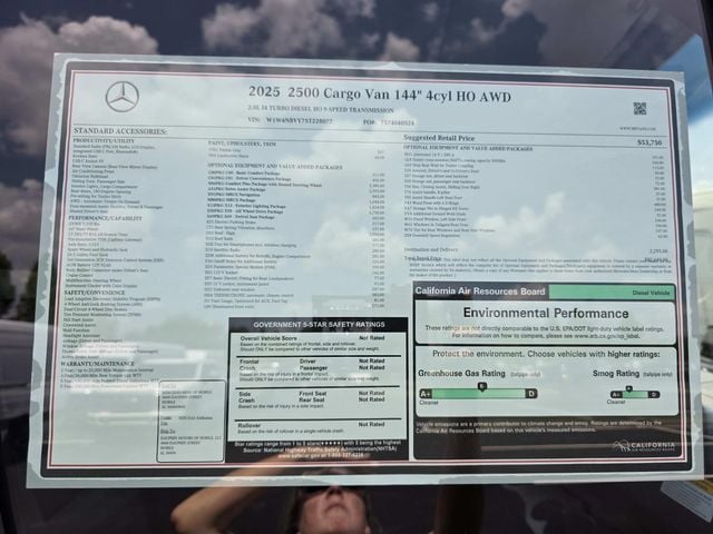 2025 Mercedes-Benz Sprinter 2500 Cargo 144 WB 4MATIC(R) Gray 4MATIC(R) 4MATIC(R) 9-Speed Automatic 2.0L I4 Diesel Turbocharged High Output 16" x 6.5J Steel Wheels, 3.923 Axle Ratio, 4-Wheel Disc Brakes, 5 Speakers, ABS brakes, Air Conditioning, All Wheel Drive Package, AM/FM radio, Armrest for Driver's Seat, Armrest for Front Passenger's Seat, Bodyside moldings, Brake assist, Co-Driver Thorax-Pelvis Sidebag, Driver door bin, Driver's Seat Mounted Armrest, Driver's Seat Occupancy Sensor, Dual front impact airbags, Dual front side impact airbags, Electronic Stability Control, Emergency communication system, Exterior Parking Camera Rear, Front anti-roll bar, Front Bucket Seats, Front Passenger Airbag, Front wheel independent suspension, Fully automatic headlights, Heated door mirrors, Heated Driver's Seat, Heated front seats, Illuminated entry, Low tire pressure warning, Maturin Fabric Upholstery, No Factory Installed Flooring, Outside temperature display, Overhead airbag, Overhead console, Passenger door bin, Passenger seat mounted armrest, Power door mirrors, Power steering, Power windows, Radio: Standard, Rain sensing wipers, Rear anti-roll bar, Remote keyless entry, Speed control, Speed-sensing steering, Standard Driver Seat, Standard Front Passenger Seat, Steering wheel mounted audio controls, Tachometer, Tilt steering wheel, Traction control, Variably intermittent wipers.