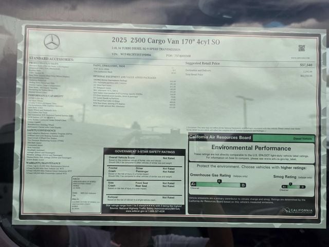 2025 Mercedes-Benz Sprinter 2500 Cargo 170 WB High Roof White High Roof RWD 9-Speed Automatic 2.0L 4-Cylinder 16" x 6.5J Steel Wheels, 3.923 Axle Ratio, 4-Wheel Disc Brakes, 5 Speakers, ABS brakes, Air Conditioning, AM/FM radio, Armrest for Driver's Seat, Armrest for Front Passenger's Seat, Bodyside moldings, Brake assist, Co-Driver Thorax-Pelvis Sidebag, Driver door bin, Driver's Seat Mounted Armrest, Driver's Seat Occupancy Sensor, Dual front impact airbags, Dual front side impact airbags, Electronic Stability Control, Emergency communication system, Exterior Parking Camera Rear, Front anti-roll bar, Front Bucket Seats, Front Passenger Airbag, Front wheel independent suspension, Fully automatic headlights, Heated door mirrors, Heated Driver's Seat, Heated front seats, Illuminated entry, Low tire pressure warning, Maturin Fabric Upholstery, No Factory Installed Flooring, Outside temperature display, Overhead airbag, Overhead console, Passenger door bin, Passenger seat mounted armrest, Power door mirrors, Power steering, Power windows, Radio: Standard, Rain sensing wipers, Remote keyless entry, Speed control, Standard Driver Seat, Standard Front Passenger Seat, Steering wheel mounted audio controls, Tachometer, Tilt steering wheel, Traction control, Variably intermittent wipers.