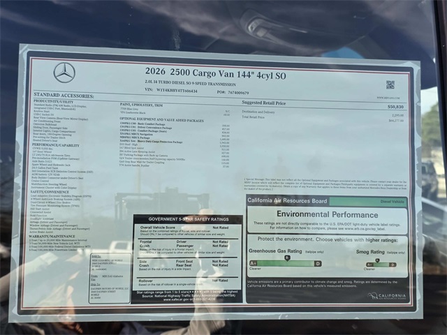 2026 Mercedes-Benz Sprinter 2500 Cargo 144 WB Blue / Gray RWD 9-Speed Automatic 2.0L 4-Cylinder 16" x 6.5J Steel Wheels, 3.923 Axle Ratio, 4-Wheel Disc Brakes, 5 Speakers, ABS brakes, Air Conditioning, AM/FM radio, Armrest For Driver's Seat, Armrest For Front Passenger's Seat, Bodyside moldings, Brake assist, Driver door bin, Driver's Seat Mounted Armrest, Driver's Seat Occupancy Sensor, Dual front impact airbags, Dual front side impact airbags, Electronic Stability Control, Emergency communication system, Exterior Parking Camera Rear, Front anti-roll bar, Front Bucket Seats, Front wheel independent suspension, Fully automatic headlights, Heated door mirrors, Heated Driver's Seat, Heated front seats, Illuminated entry, Low tire pressure warning, Maturin Fabric Upholstery, No Factory Installed Flooring, Outside temperature display, Overhead airbag, Overhead console, Passenger door bin, Passenger seat mounted armrest, Power door mirrors, Power steering, Power windows, Radio: Standard, Rain sensing wipers, Rear anti-roll bar, Remote keyless entry, Speed control, Standard Driver Seat, Standard Front Passenger Seat, Steering wheel mounted audio controls, Tachometer, Tilt steering wheel, Traction control, Variably intermittent wipers.