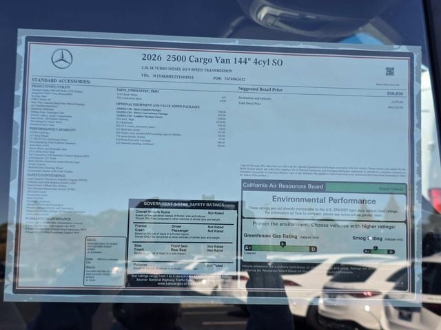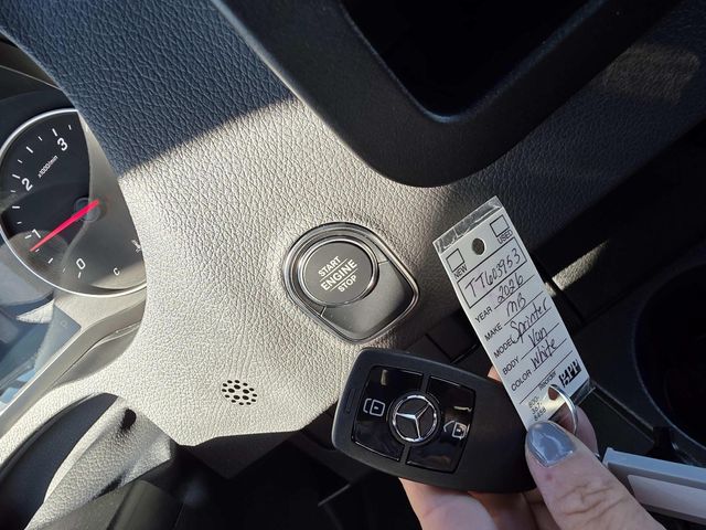 2026 Mercedes-Benz Sprinter 2500 Cargo 144 WB White RWD 9-Speed Automatic 2.0L 4-Cylinder 16" x 6.5J Steel Wheels, 3.923 Axle Ratio, 4-Wheel Disc Brakes, 5 Speakers, ABS brakes, Air Conditioning, AM/FM radio, Armrest For Driver's Seat, Armrest For Front Passenger's Seat, Bodyside moldings, Brake assist, Driver door bin, Driver's Seat Mounted Armrest, Driver's Seat Occupancy Sensor, Dual front impact airbags, Dual front side impact airbags, Electronic Stability Control, Emergency communication system, Exterior Parking Camera Rear, Front anti-roll bar, Front Bucket Seats, Front wheel independent suspension, Fully automatic headlights, Heated door mirrors, Heated Driver's Seat, Heated front seats, Illuminated entry, Low tire pressure warning, Maturin Fabric Upholstery, No Factory Installed Flooring, Outside temperature display, Overhead airbag, Overhead console, Passenger door bin, Passenger seat mounted armrest, Power door mirrors, Power steering, Power windows, Radio: Standard, Rain sensing wipers, Rear anti-roll bar, Remote keyless entry, Speed control, Standard Driver Seat, Standard Front Passenger Seat, Steering wheel mounted audio controls, Tachometer, Tilt steering wheel, Traction control, Variably intermittent wipers.