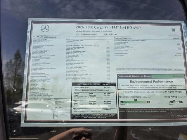 2026 Mercedes-Benz Sprinter 2500 Cargo 144 WB 4MATIC(R) Gray 4MATIC(R) 4MATIC(R) 9-Speed Automatic 2.0L I4 Diesel Turbocharged High Output 16" x 6.5J Steel Wheels, 3.923 Axle Ratio, 4-Wheel Disc Brakes, 5 Speakers, ABS brakes, Air Conditioning, All Wheel Drive Package, AM/FM radio, Armrest For Driver's Seat, Armrest For Front Passenger's Seat, Bodyside moldings, Brake assist, Driver door bin, Driver's Seat Mounted Armrest, Driver's Seat Occupancy Sensor, Dual front impact airbags, Dual front side impact airbags, Electronic Stability Control, Emergency communication system, Exterior Parking Camera Rear, Front anti-roll bar, Front Bucket Seats, Front wheel independent suspension, Fully automatic headlights, Heated door mirrors, Heated Driver's Seat, Heated front seats, Illuminated entry, Low tire pressure warning, Maturin Fabric Upholstery, No Factory Installed Flooring, Outside temperature display, Overhead airbag, Overhead console, Passenger door bin, Passenger seat mounted armrest, Power door mirrors, Power steering, Power windows, Radio: Standard, Rain sensing wipers, Rear anti-roll bar, Remote keyless entry, Speed control, Speed-sensing steering, Standard Driver Seat, Standard Front Passenger Seat, Steering wheel mounted audio controls, Tachometer, Tilt steering wheel, Traction control, Variably intermittent wipers.
