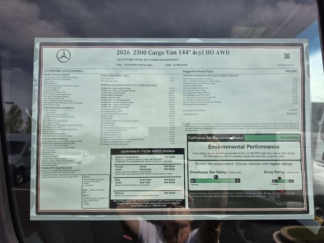 2026 Mercedes-Benz Sprinter 2500 Cargo 144 WB 4MATIC(R) Gray 4MATIC(R) 4MATIC(R) 9-Speed Automatic 2.0L I4 Diesel Turbocharged High Output 16" x 6.5J Steel Wheels, 3.923 Axle Ratio, 4-Wheel Disc Brakes, 5 Speakers, ABS brakes, Air Conditioning, All Wheel Drive Package, AM/FM radio, Armrest For Driver's Seat, Armrest For Front Passenger's Seat, Bodyside moldings, Brake assist, Driver door bin, Driver's Seat Mounted Armrest, Driver's Seat Occupancy Sensor, Dual front impact airbags, Dual front side impact airbags, Electronic Stability Control, Emergency communication system, Exterior Parking Camera Rear, Front anti-roll bar, Front Bucket Seats, Front wheel independent suspension, Fully automatic headlights, Heated door mirrors, Heated Driver's Seat, Heated front seats, Illuminated entry, Low tire pressure warning, Maturin Fabric Upholstery, No Factory Installed Flooring, Outside temperature display, Overhead airbag, Overhead console, Passenger door bin, Passenger seat mounted armrest, Power door mirrors, Power steering, Power windows, Radio: Standard, Rain sensing wipers, Rear anti-roll bar, Remote keyless entry, Speed control, Speed-sensing steering, Standard Driver Seat, Standard Front Passenger Seat, Steering wheel mounted audio controls, Tachometer, Tilt steering wheel, Traction control, Variably intermittent wipers.